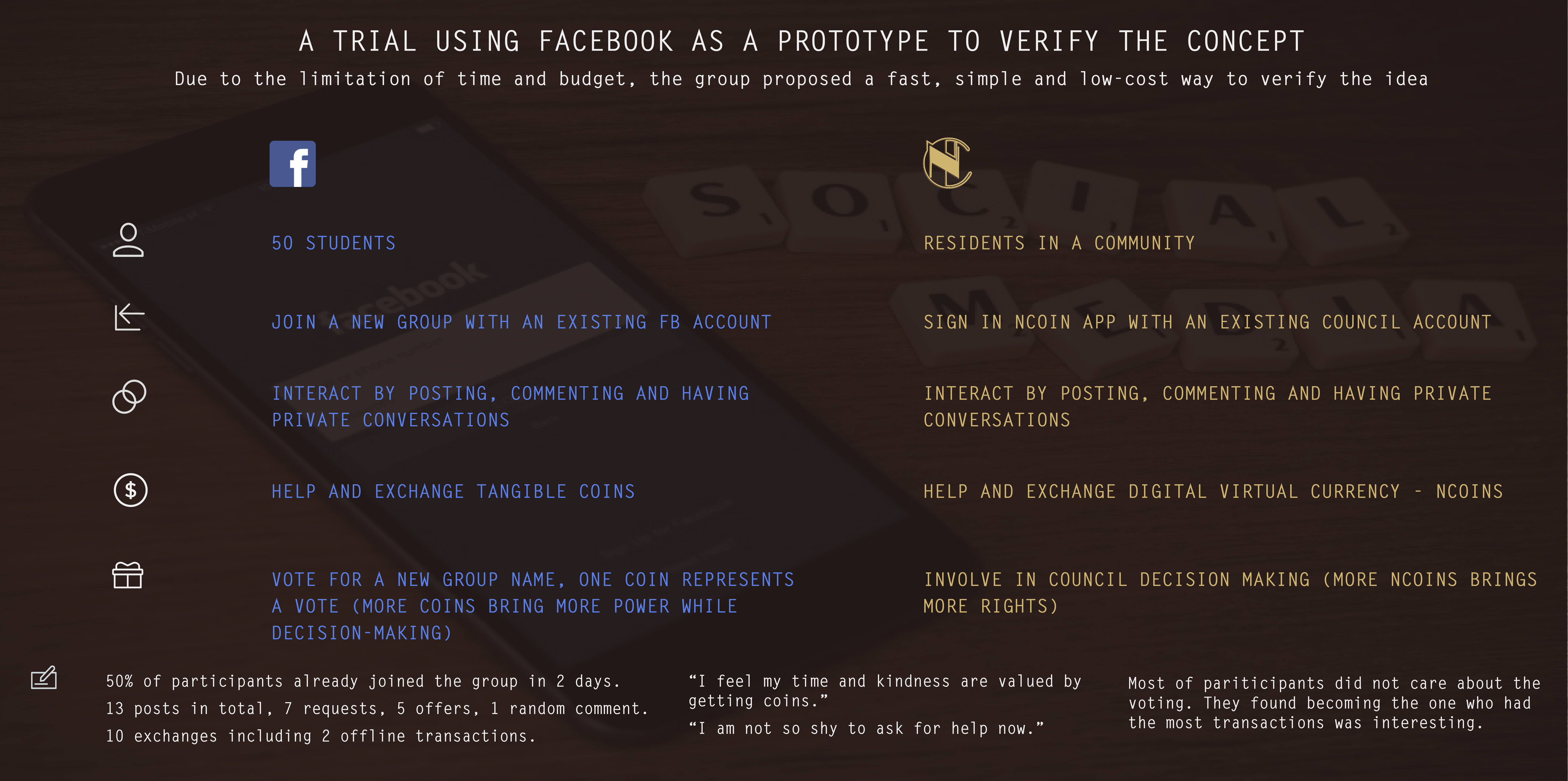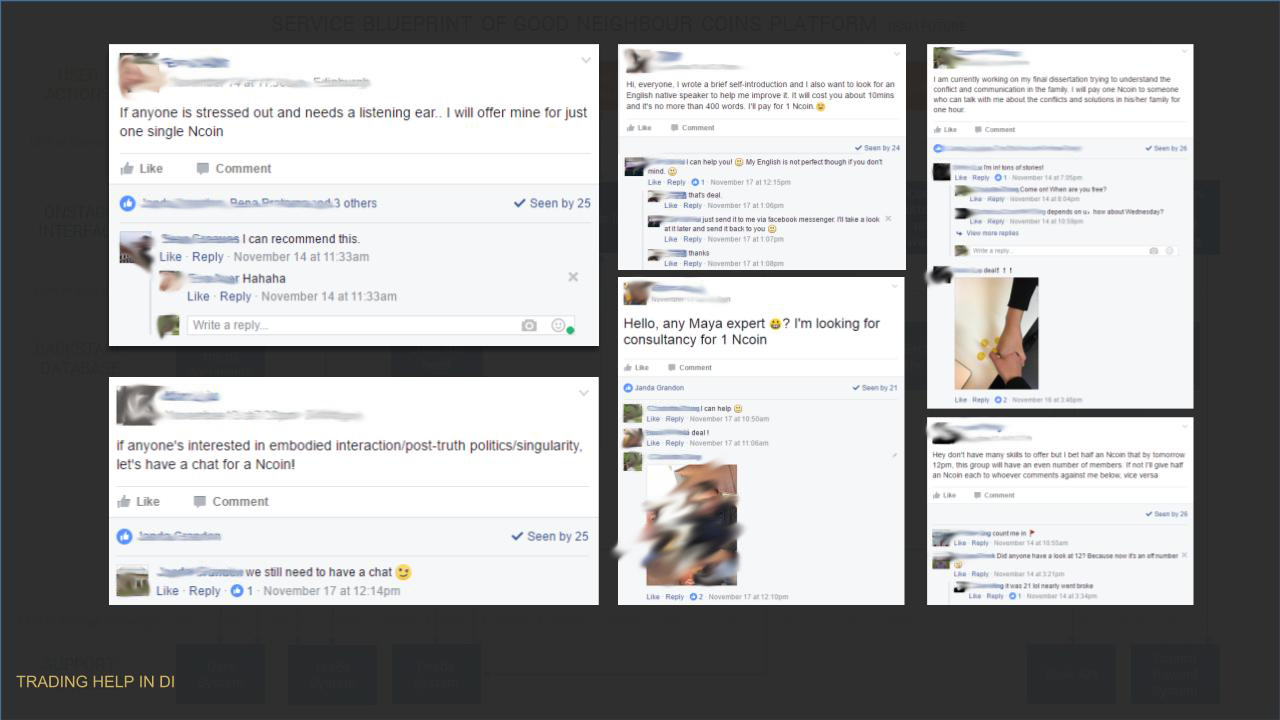 The result showed that half of the class had joined the DI Trading Help group in two days. There were 13 posts in total, 7 of which were requests while 5 were offers. A gambling post evoked our awareness of the potential misuses. There were 10 exchanges including two offline transactions. The contents of the requests and offers were able to be mapped into the behaviours and actions in the reality, for example, helping to bring a book to the library was aligned to helping to transport the trash. Some participants mentioned that they did not often ask for help. But with the NCoins, they were able to reward others’ time. Similarly, they also felt that their time and kindness were valued by getting the NCoins. Another important finding from the interview was that most of them did not care about the voting, however, they found becoming the one who had the most transactions was interesting. This suggested a ranking of successful transactions could be implemented as rewards instead of the financial reward or voting authorisation, which was similar to the credits provided by many platforms such as Stack Overflow and Quora.
