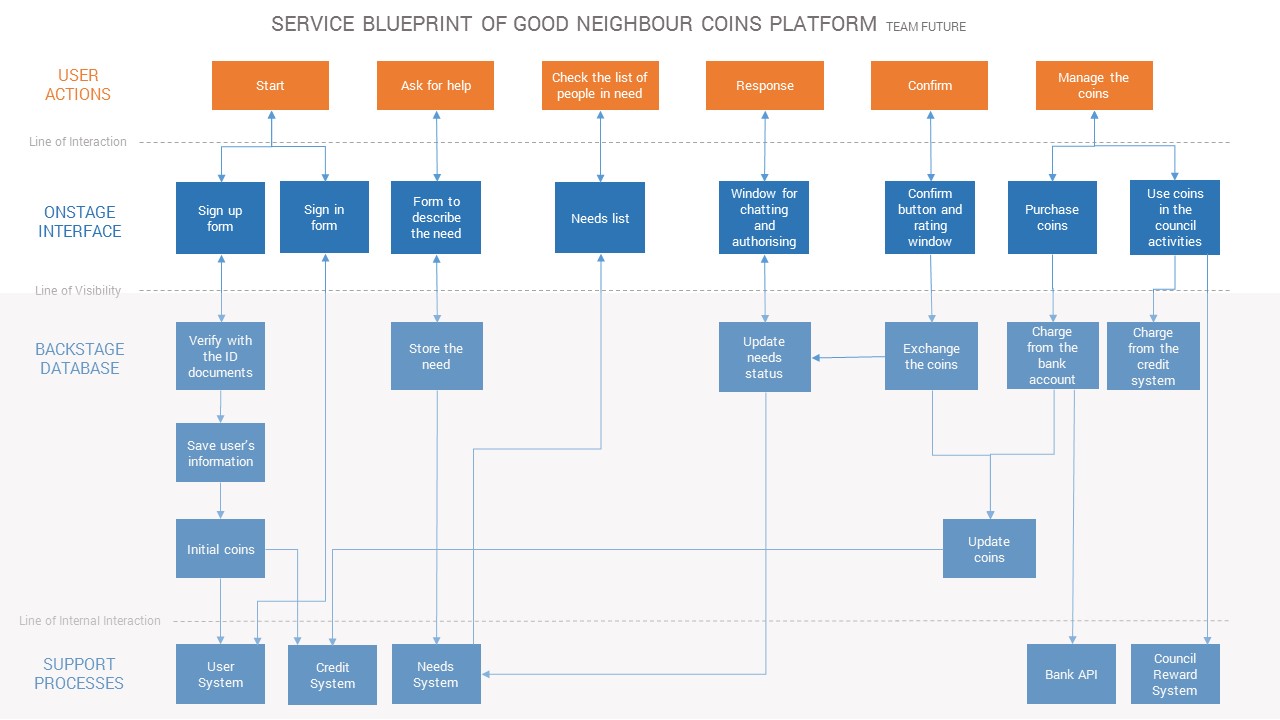 The team utilised Persona driven by the existing analysis and hypothesis to understand, describe, focus and clarify users’ goals. Based on the Brainstorming, the team proposed a Service Blueprint to map the user touch points to system design.