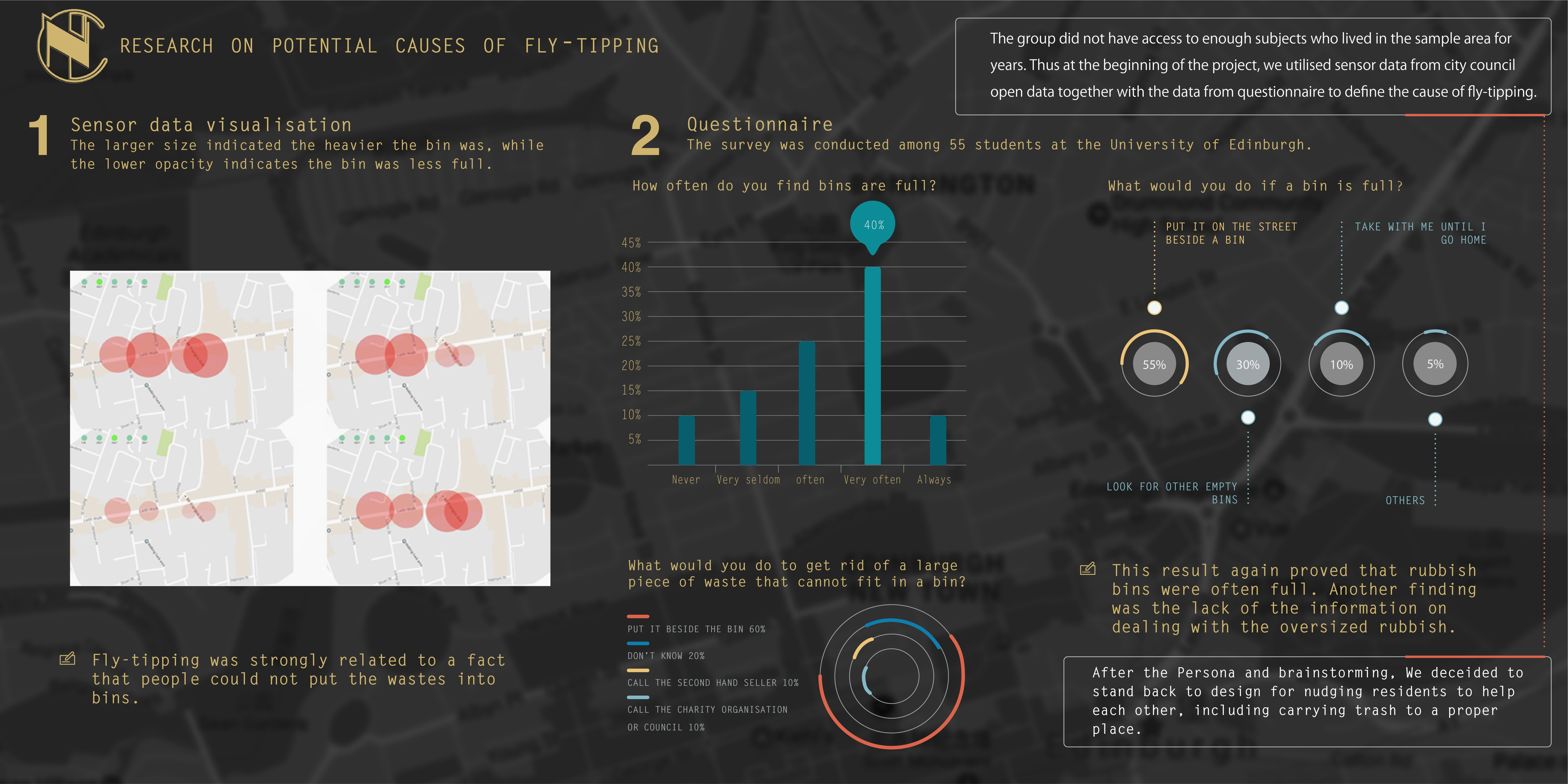 Edinburgh City Council is looking for solutions to deal with fly-tipping situation. In this course, I utilised different methods to collect data. With quantative and qualitative data, the team generated and verified the concept - using virtual currency to materialise the value of doing good deeds to the neighbours. I used the project as a case study with relevant literature to discuss how data assits the product design process.