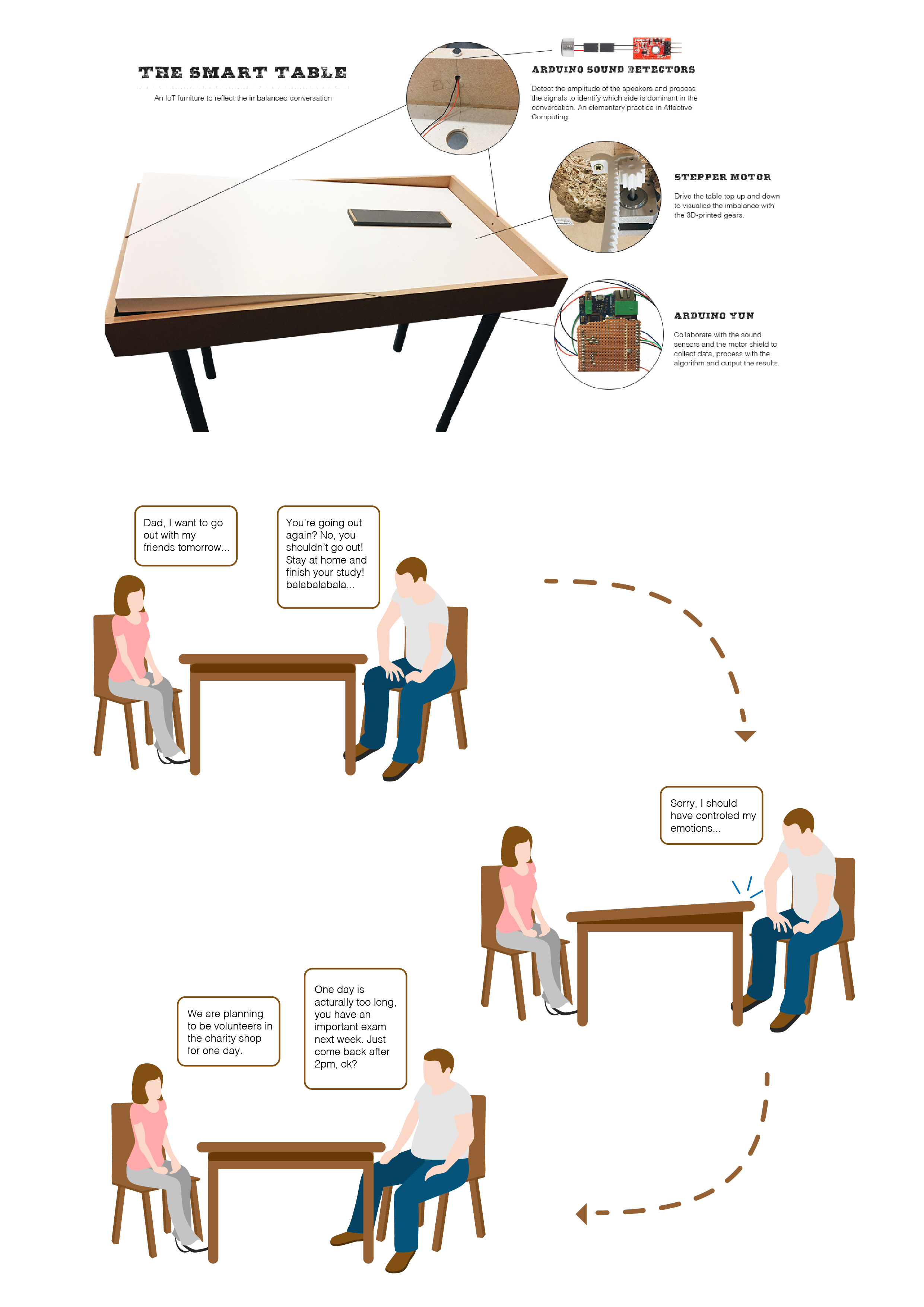 Unhealthy communication patterns influences the relationships between two parties, “It is not what you say, it is how you say it”. Emotion regulation in communication requires people to empathise with the other side and to keep reflecting on his/her own behaviours. The Smart Table physically reflects the dominance of a person in a conversation, aiming at helping families and other disputing or contentious parties, to ease tensions and find more harmonious ways to communicate.