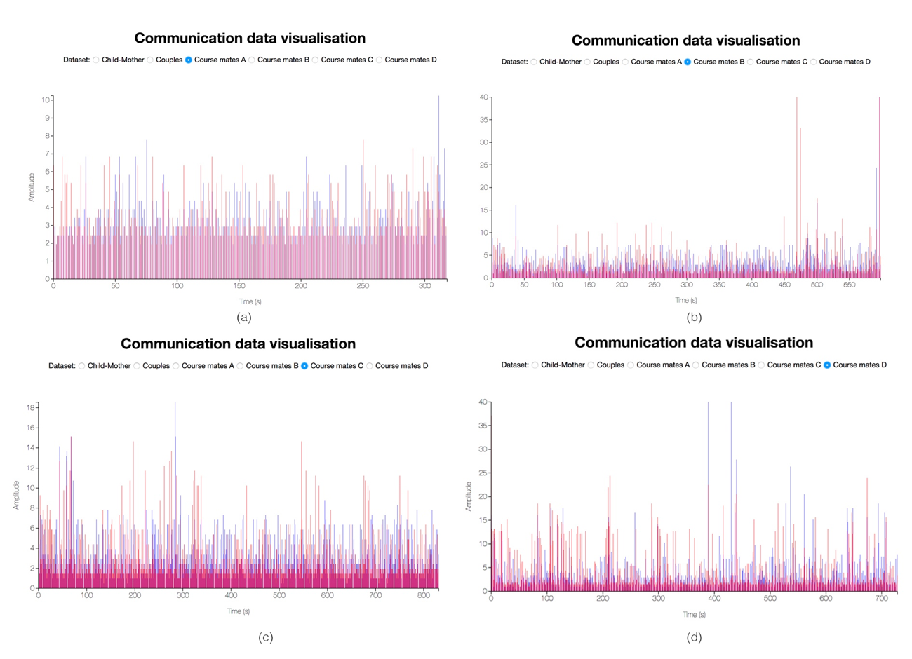 Although the sensor data is not accurate enough to analyse the talking volumes and pitches of both sides, we can still observe the overall talking patterns from the data visualisations. Group Course Mates A (a) and B (b) had a relatively balanced conversation, yet in Group B, the talking duration was relatively longer. These two groups “Strongly Agree” that the table can make them reflect on their behaviours and emotions. The data of Course Mates D (d) represented those groups that started with an “imbalanced conversation”, but after the table reacted to their conversation, the “dominant sides” adjusted the talking length. We can see from the figure, during the first 180 seconds “the Red side” talked predominantly, then the speaker role was taken in turn within a generally fixed duration. This was the most common reactions sequences of participants:
