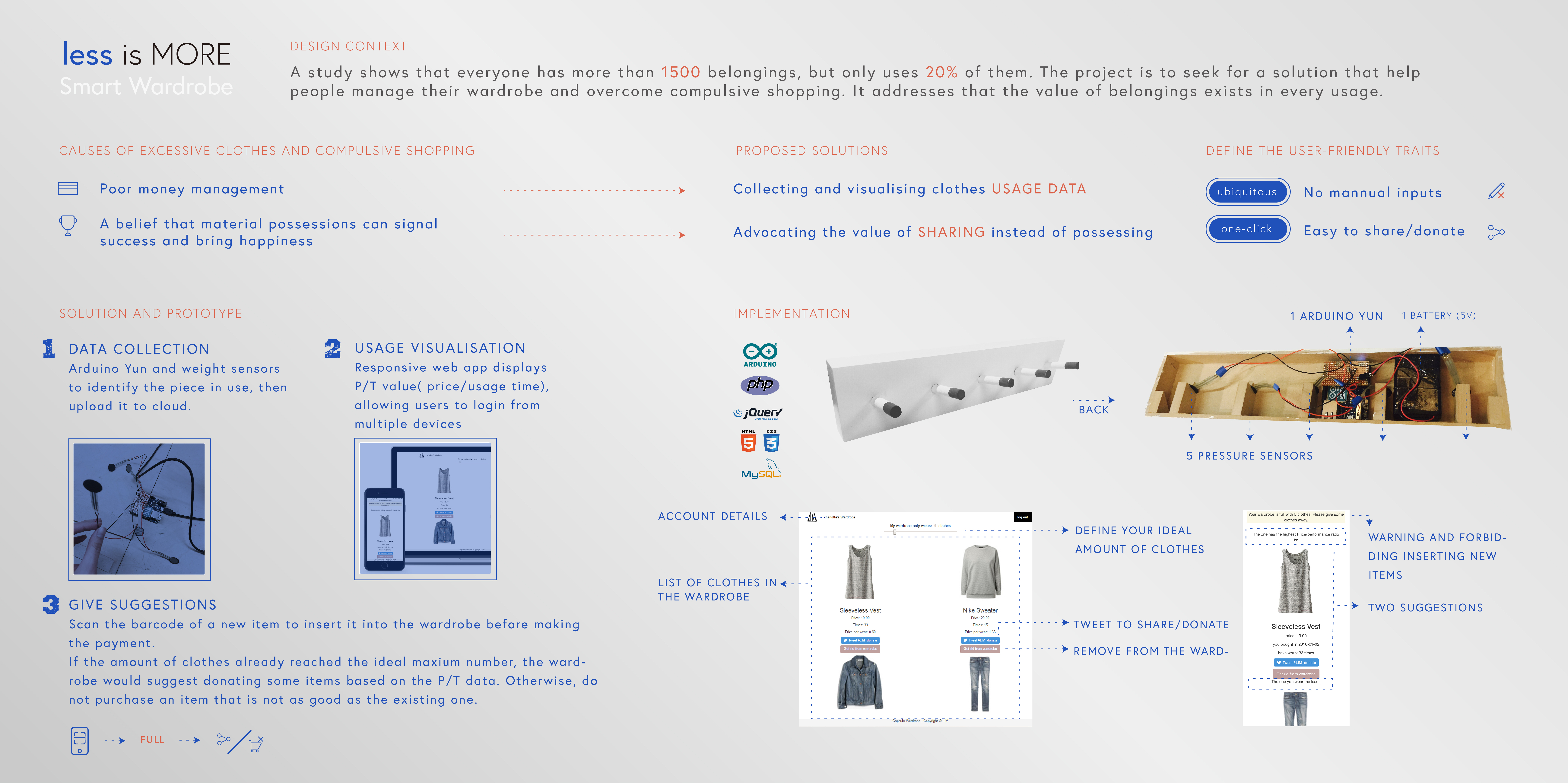 This practice proved it is helpful to avoid emotional shopping or compulsive shopping by tracking and recalling the existing possessions. However, not everyone can persistently record the data, that is the reason why an “IoT wardrobe assistant” concept came to exist.